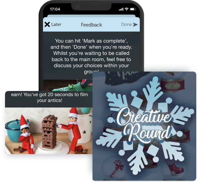 To begin, your Remote Host will introduce the game and split your group into teams of 3-4 people. Teams will first be given an icebreaker prompt and moved into breakout rooms. In round 2, all players will be recalled to the main room where they’ll complete 8 merry photo and video challenges. The last round will consist of quick-fire trivia in breakout rooms, before a fun-filled wrap up!