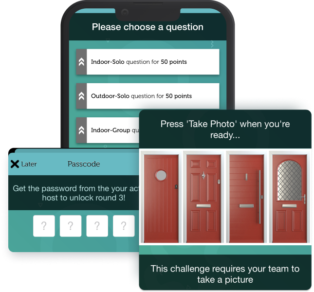 Our in-person gameplay brings teams together in a location of your choice. Guided by an expert Remote Host, you and your team will complete your activity using your own devices.